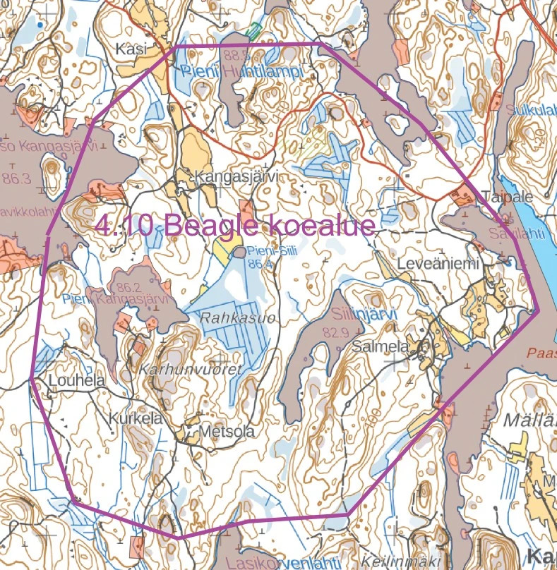 Beagle ajokokeet 4.10 Rahkasuon alueella. Vältä metsästystä kyseisellä alueella tuona ajankohtana!